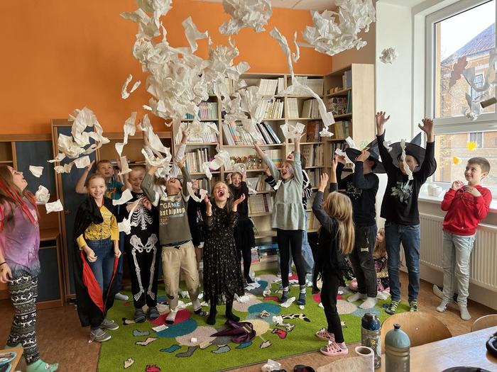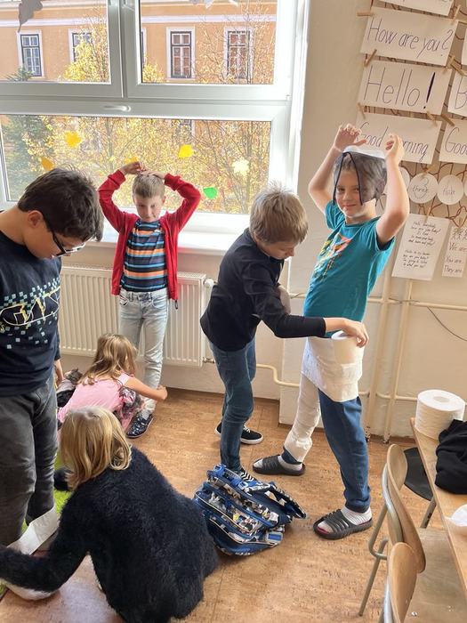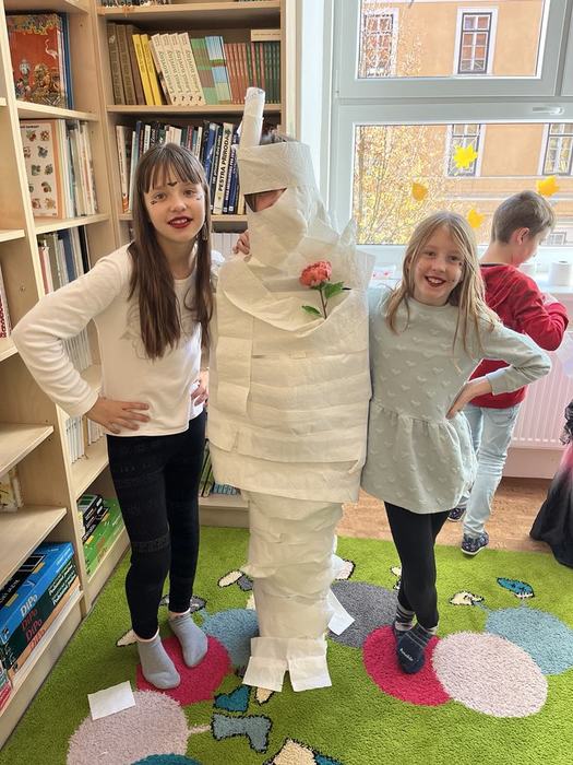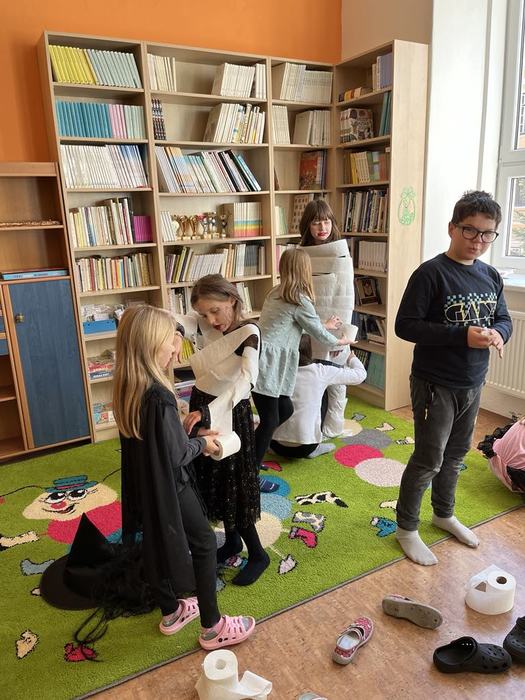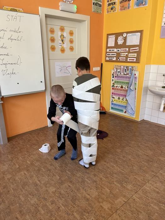 V pátek 1. 11. zažili žáci 3. - 5. ročníku netradiční hodinu angličtiny. I když se Halloween objevuje už i u nás v Česku, stále nesmíme zapomínat, odkud tento svátek pochází. Povídali jsme si o tom, jak se Halloween slaví v anglicky mluvících zemích, jaké jsou jeho zvyky a symboly, a proč se vydlabávají zrovna dýně. Některé děti se nám pomocí toaletních papírů proměnily v mumie. A ti nejodvážnější dokonce ochutnali bonbony se speciálními příchutěmi, např. ryba nebo zubní pasta.