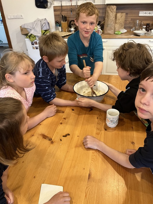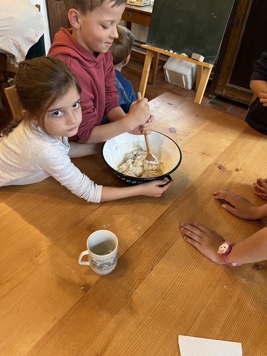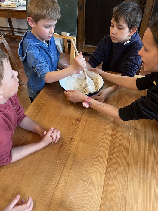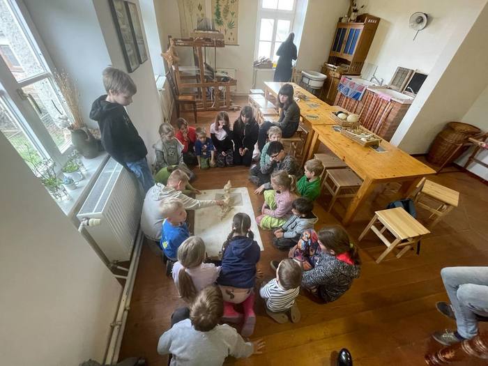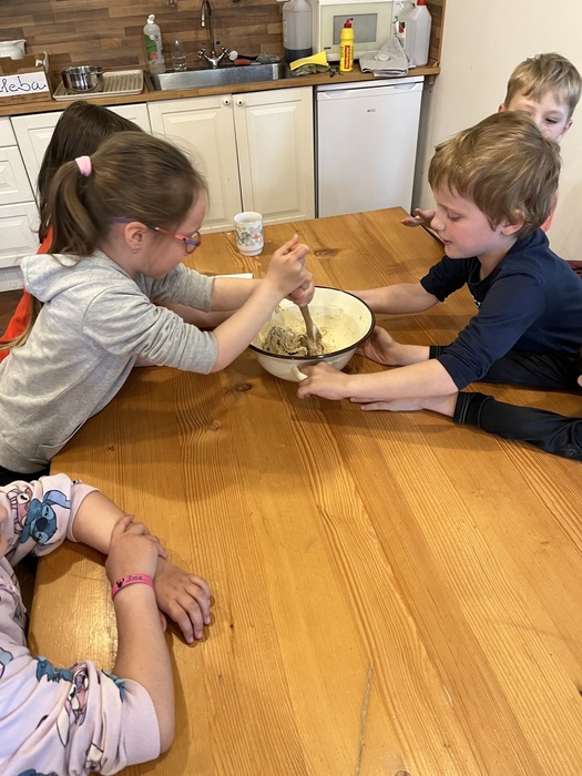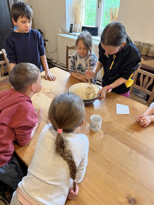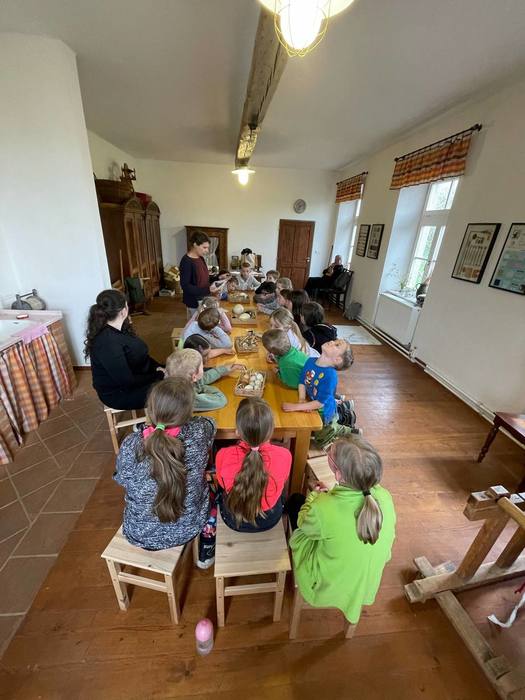 Druhá část programu byla věnována pečení chleba a stloukání másla. Děti vlastnoručně zadělaly těsto na chléb, uválely chlebové bochánky, které po upečení i ochutnaly. Při stloukání másla odhalovaly postup, kterým máslo vzniká. Společně zjistily, kolik se za takovou svačinkou skrývá práce. Program byl přínosný a velice zajímavý.
