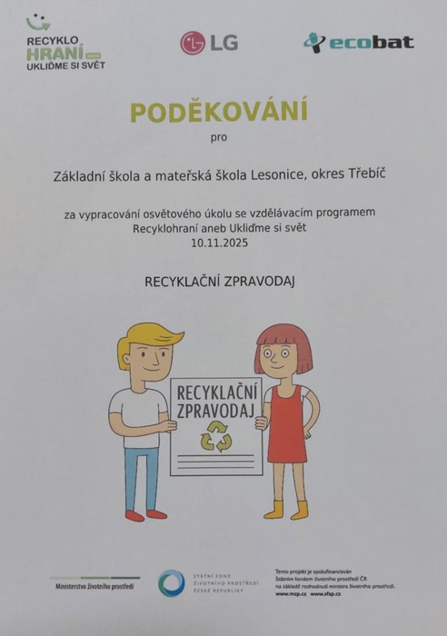 Děti se zúčastnily projektu v rámci osvěty recyklování odpadu, kde dokázaly skloubit příjemné s užitečným. Díky této příležitosti vznikly nejen krásné, ale hlavně naučné materiály, díky kterým si děti přiblížily důležitost správného třídění odpadu a ochrany životního prostředí.
