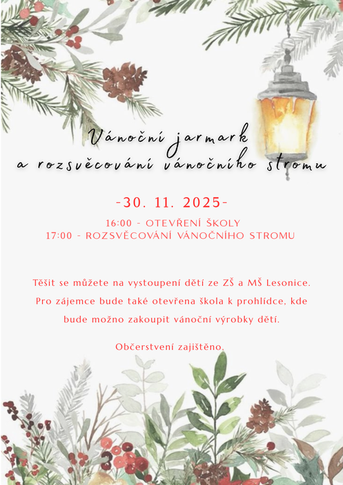 Těšit se můžete na vystoupení dětí ZŠ a MŠ Lesonice a také na vánoční jarmark s výrobky, které děti společně s učiteli pro Vás připravili a které budou ve škole k zakoupení.